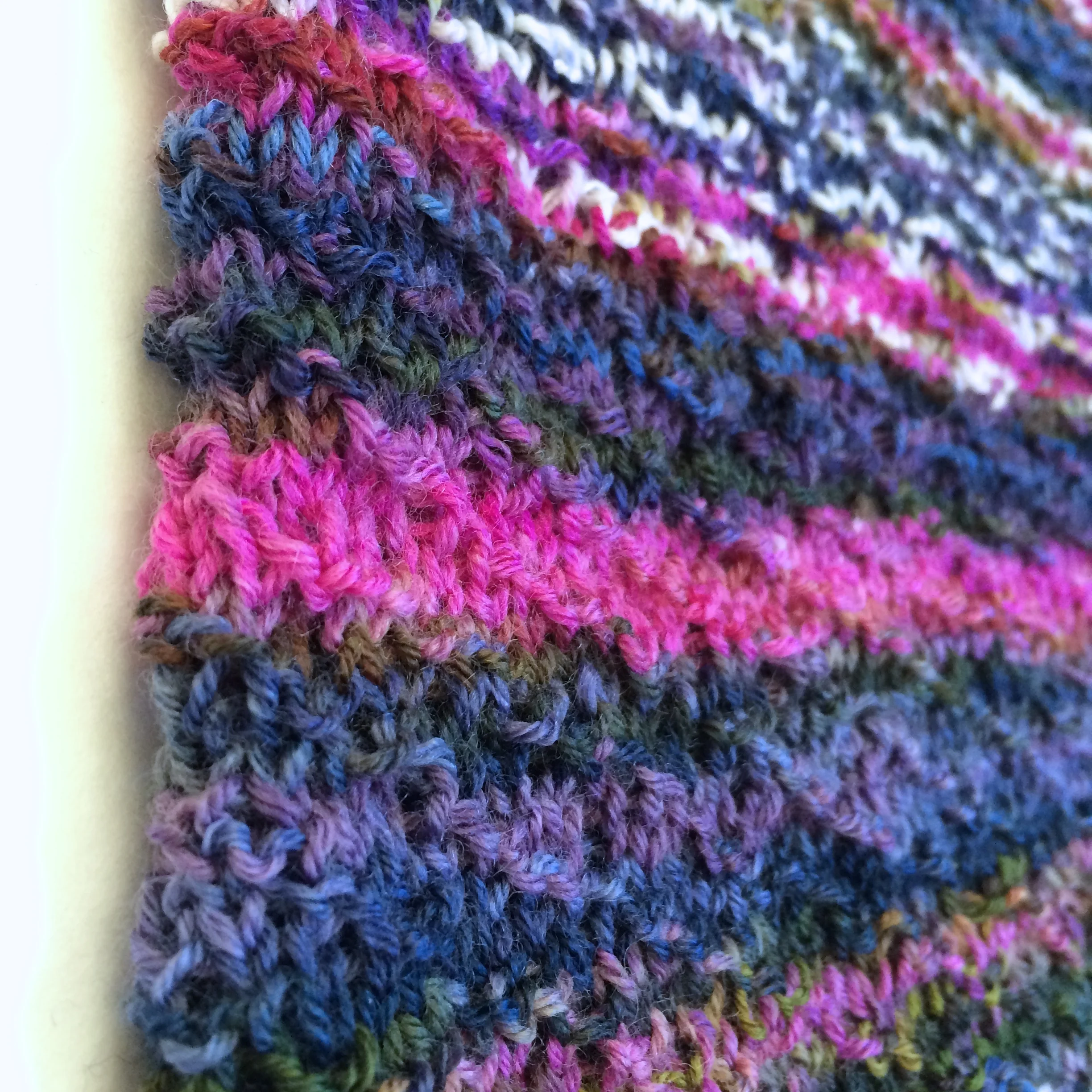 One ball of tie-dyed Schoppel-Wolle Wunderklecks yarn is all you need to create this generous and colorful cowl. The pattern features an easy to remember diagonal seed stitch pattern.