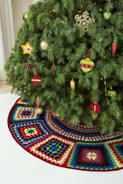 This tree skirt is made by crocheting a simple base with appliques attached.