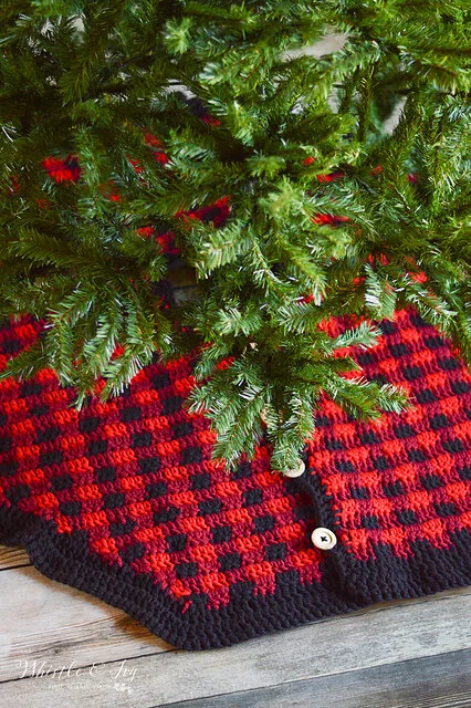 Add some rustic flair to your Christmas tree with this crochet plaid tree skirt! The wood buttons make a perfect finishing touch.