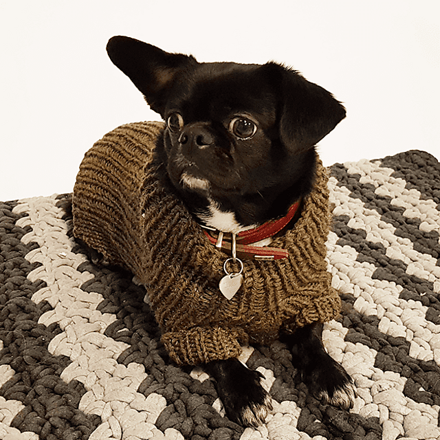 For dogs of most shapes and sizes, from yorkies and bulldogs to greyhounds and golden retrievers, the Lucky Dog Sweater Pattern uses 2 x 2 rib details to contour around the body for a smart and comfortable fit and also to lend a little drama to the collar.
