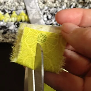Now that you've gathered your fabric, you'll need to cut it into strips. I place my ruler a little bit from the edge, then snip the fabric at 1 1/2" increments.