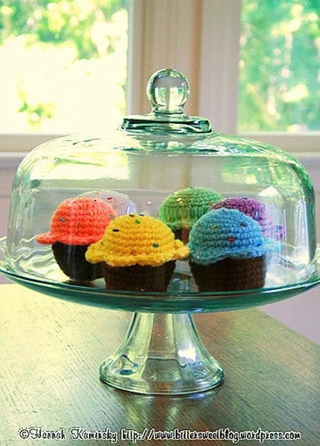 These adorable cupcakes are surprisingly easy to crochet in two pieces and then beads are added to the top as sprinkles.